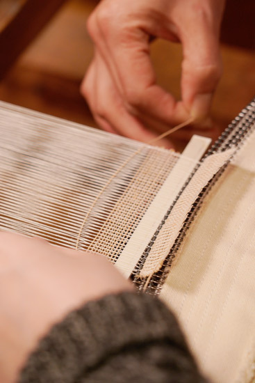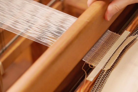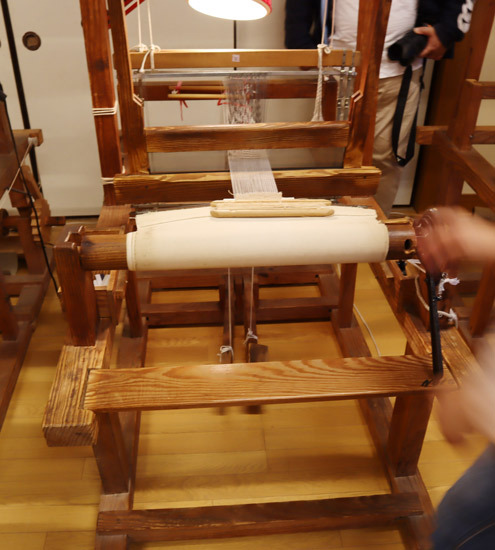 When you arrive, the looms are already set up ready with the fibers of ramie separated into a “top” and “bottom” layer. You control the loom using pedals, which you alternately press down to bring the two layers of ramie fibers together to meet at the middle.
